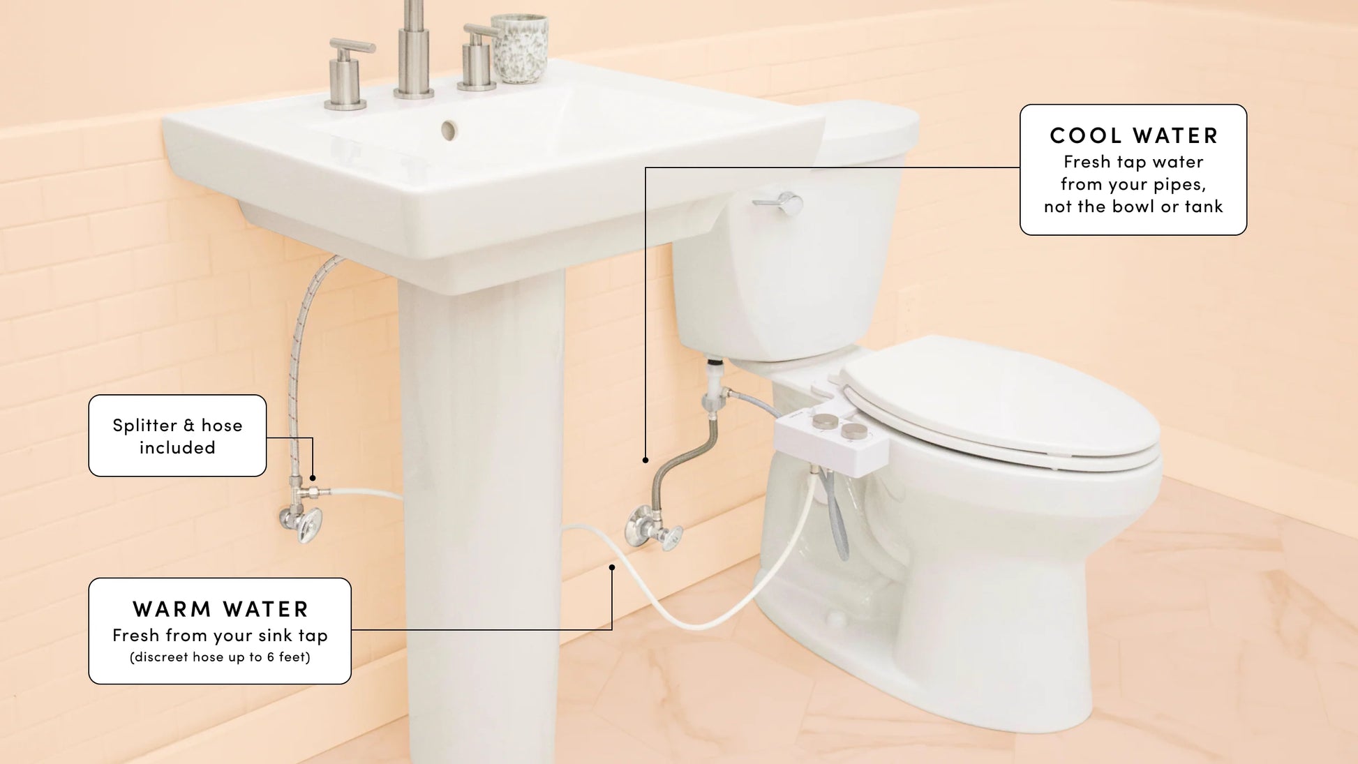 In the same way it may take a few moments for your hot water to reach your sink, the warm water of your bidet might not be available rigth away. In order to avoid an unwanted cold spray, simply turn on the knob slightly as you sit down to allow water to flow over the nozzle into the bowl without spraying. When you're ready, simply turn on the sprayer when needed. Adjust the water pressure as desired for a comfortable experience.